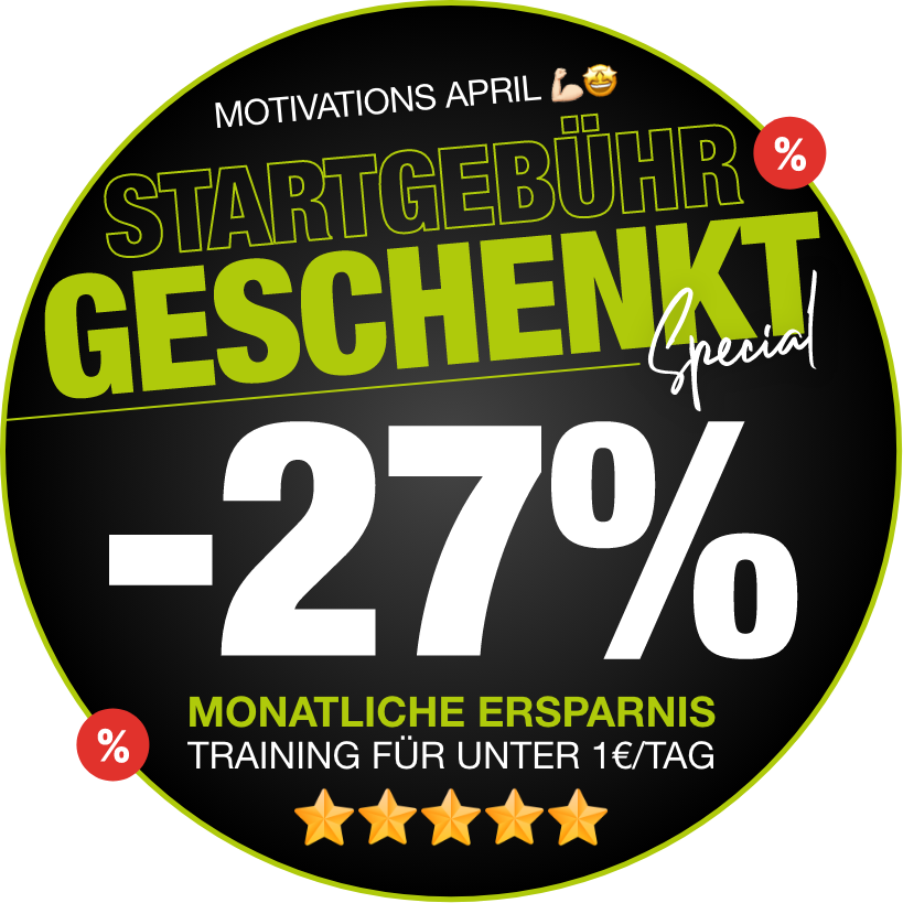 Du sparst Dir nicht nur 100€ auf die Startgebühr, sondern kannst auch jetzt noch bis Mai kostenlos trainieren. Danach trainierst du mit 42% Rabatt (-20€) pro Monat ganz entspannt weiter und bist dank Flex-Tarif monatlich flexibel. Der erste Mitgliedsbeitrag wird erst zu Mai 2026 fällig.